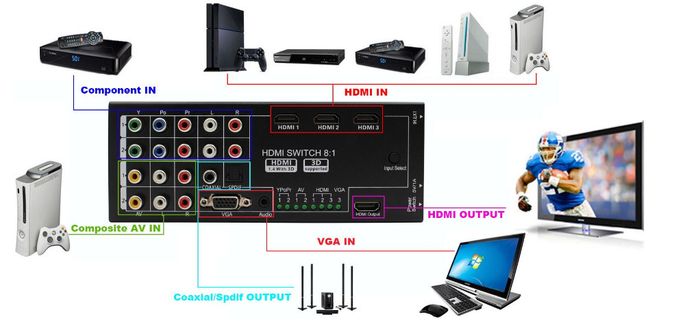 .Изображения из Многофункциональный HDMI конвертер переключатель 8 входов в HDMI + коаксиальный + spdif выход Поддержка 3D и объемный звук для 1080 P HDTV